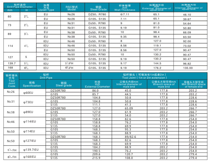 摩擦焊鉆桿及接頭執(zhí)行API / SPEC/5DP和 SY/T5561-2008標(biāo)準(zhǔn),鉆桿現(xiàn)有DZ50、R780、 G105、S135鋼級(jí),均經(jīng)過局部或整體熱處理, 機(jī)械性能滿足標(biāo)準(zhǔn)要求;接頭采用優(yōu)良的合金鋼35CrM。、4137H等調(diào)質(zhì)處理,螺紋由數(shù)控車床、成型刀具加工,表面鍍銅或磷化處理,防粘扣性能良好。也可根據(jù)客戶要求定制生產(chǎn)。